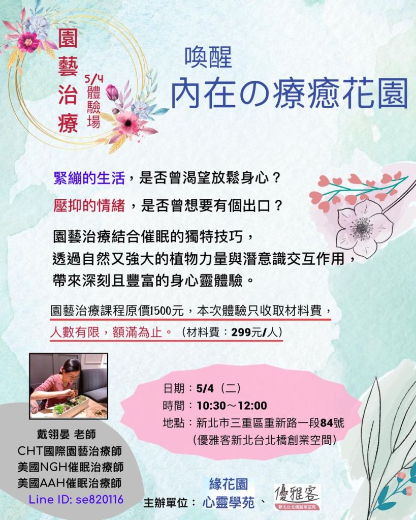主辦單位:緣花園心靈學苑、優雅客新北台北橋創業空間。