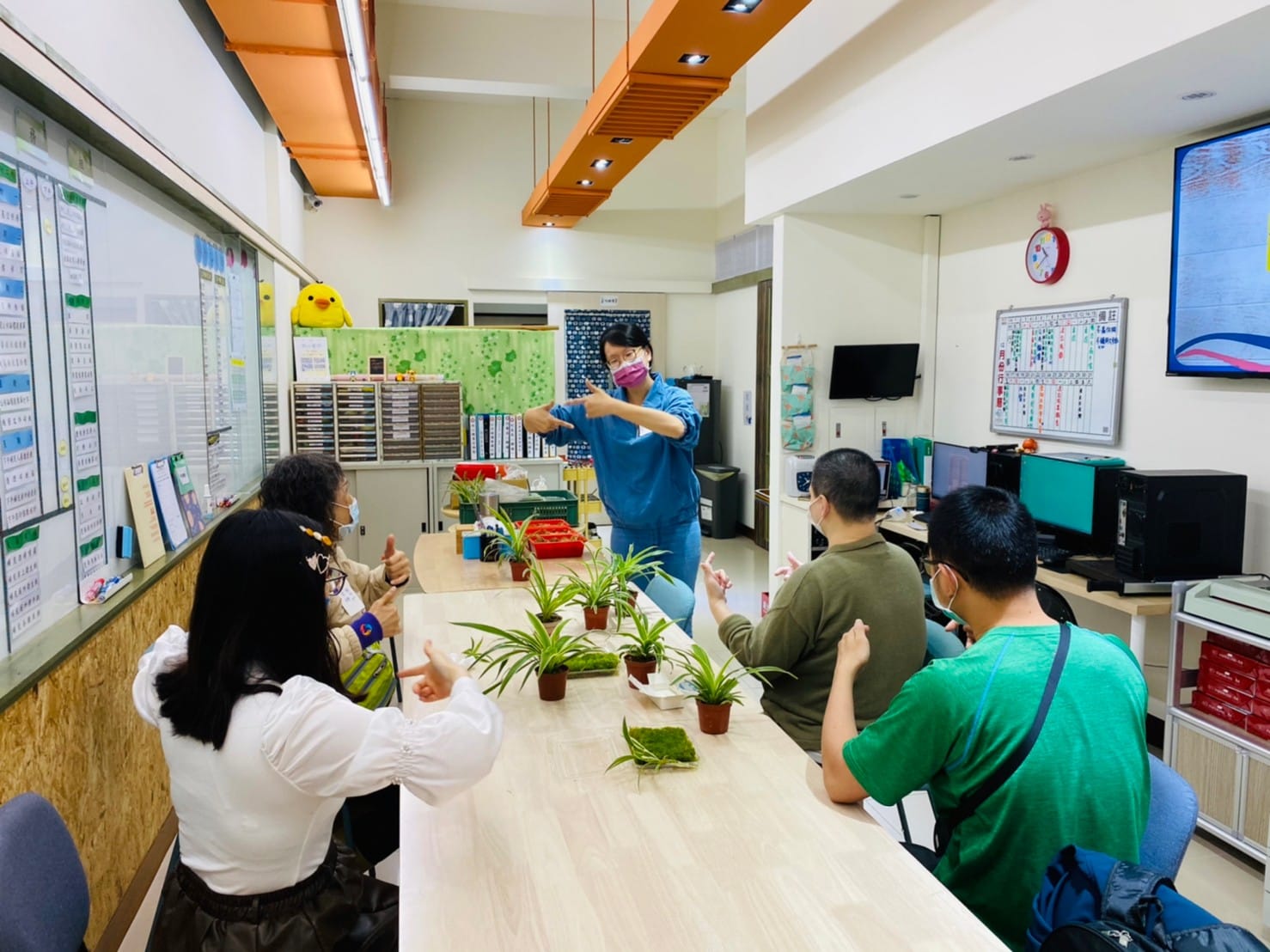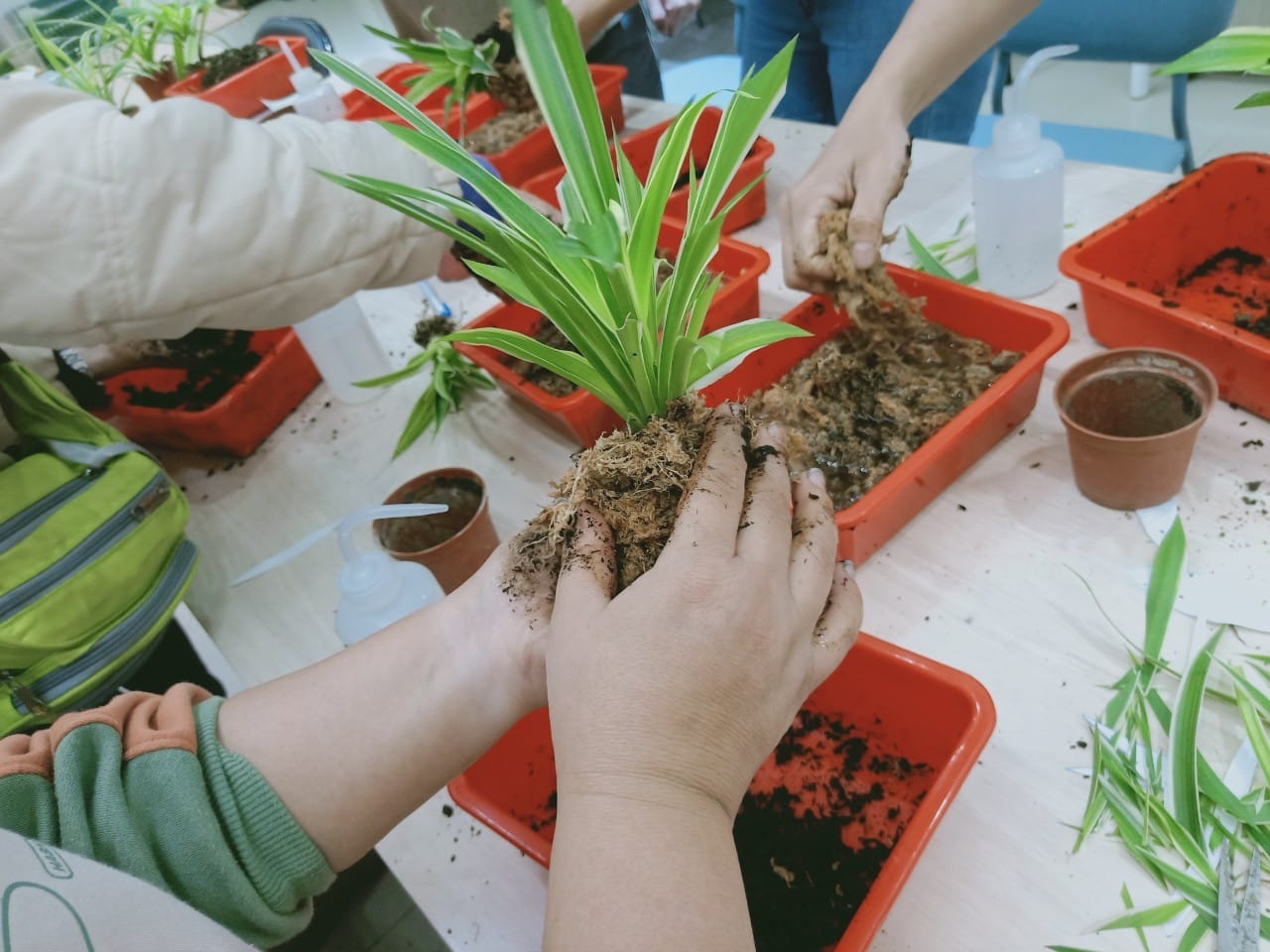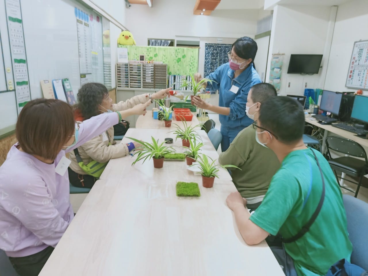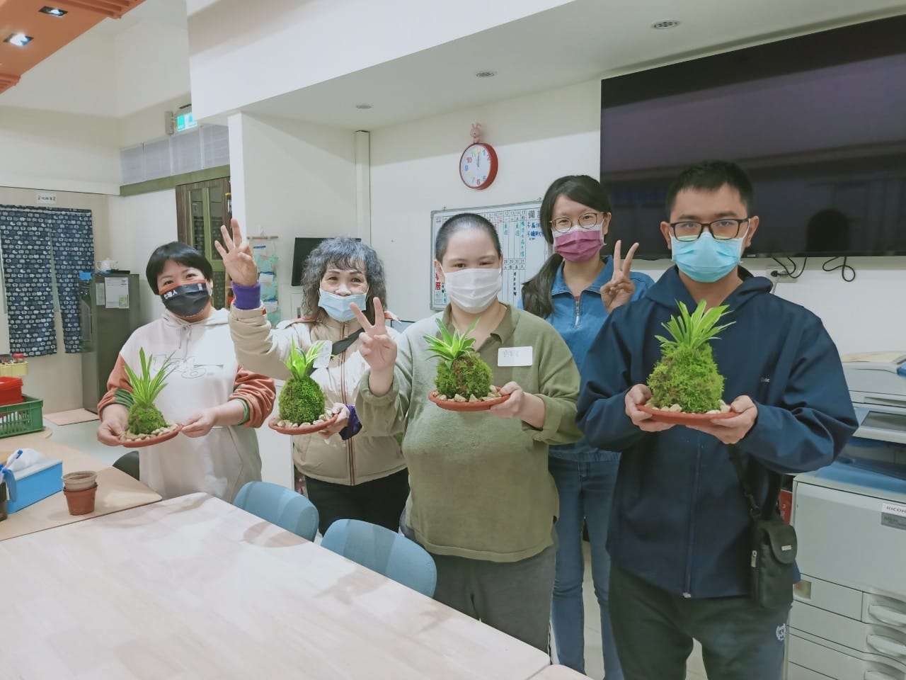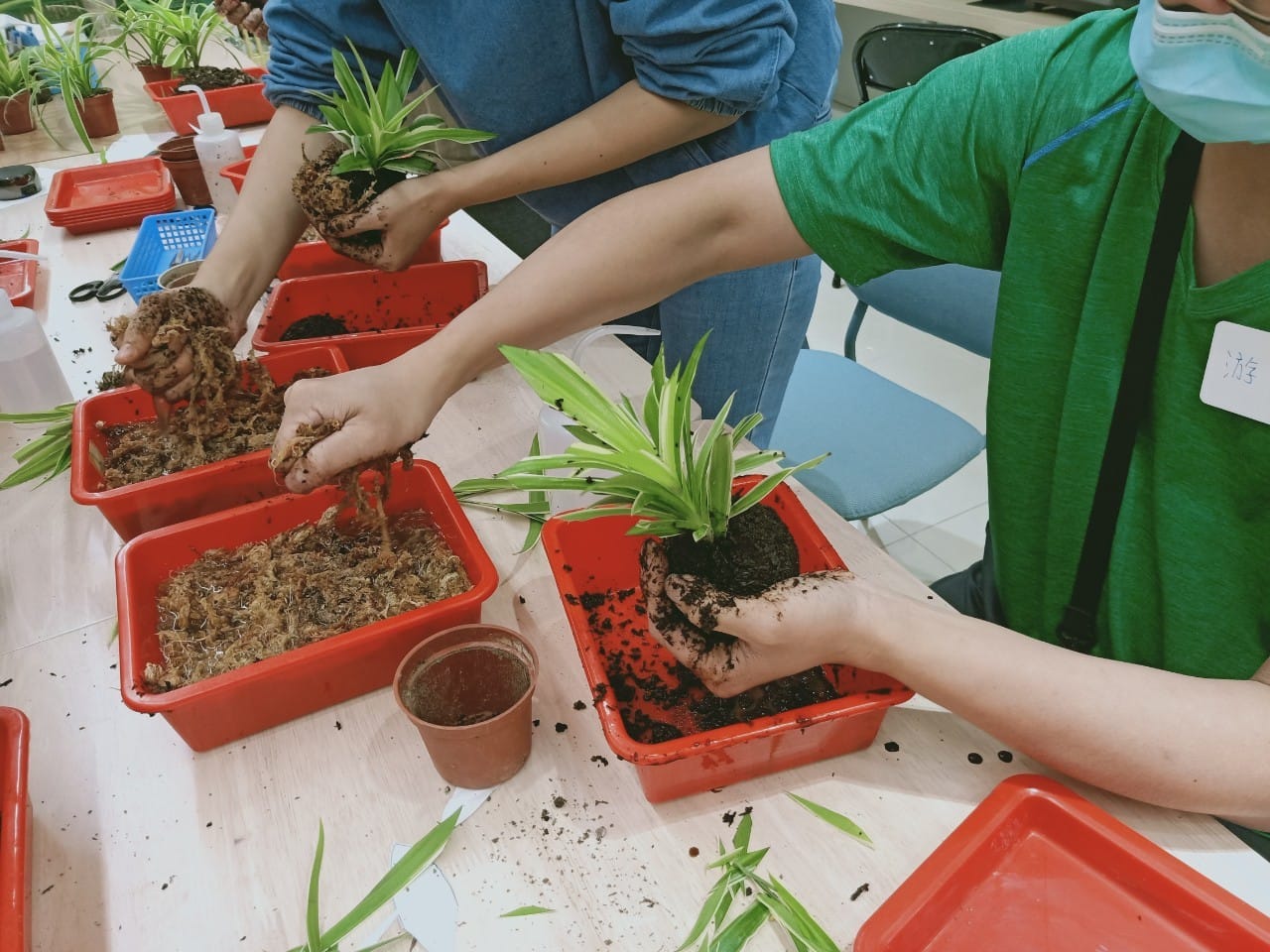 「苔球」,又可稱為「苔玉」,本次課程很開心邀請 緣心苑 的戴翎晏園藝師,帶領我們動動手指來做幸福苔玉!講師帶領會員們手指暖身律動,啟動感官,每個人都是綠手指來報到啦~~會員們跟著講師一步一步親手修剪吊蘭