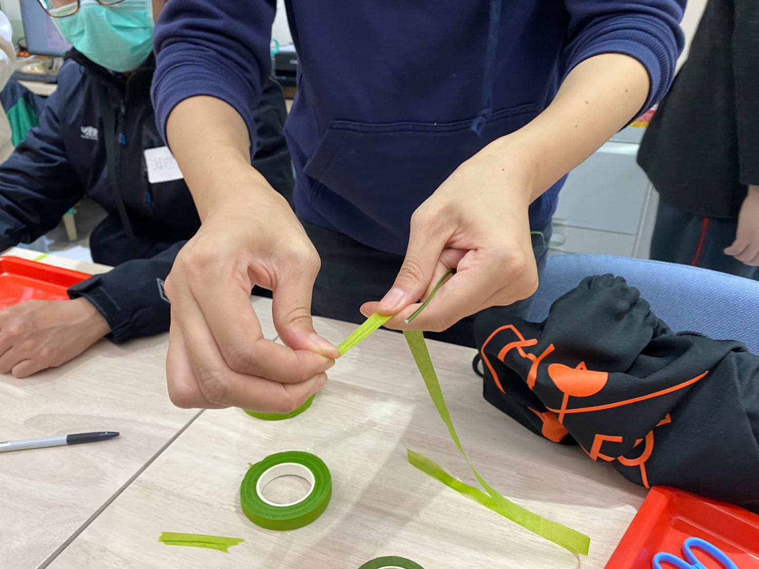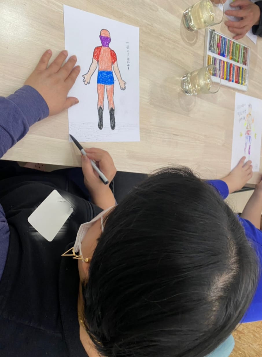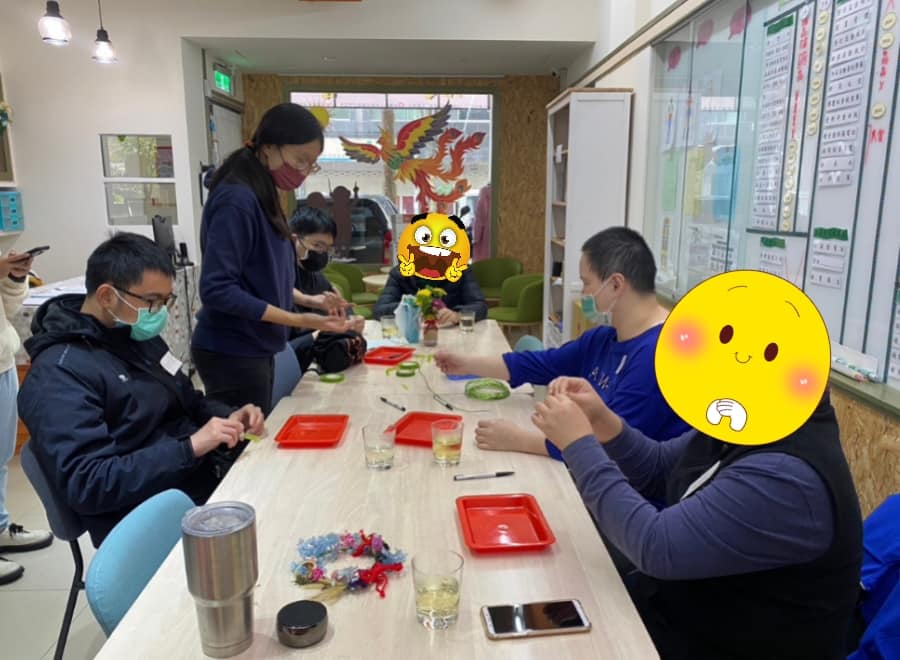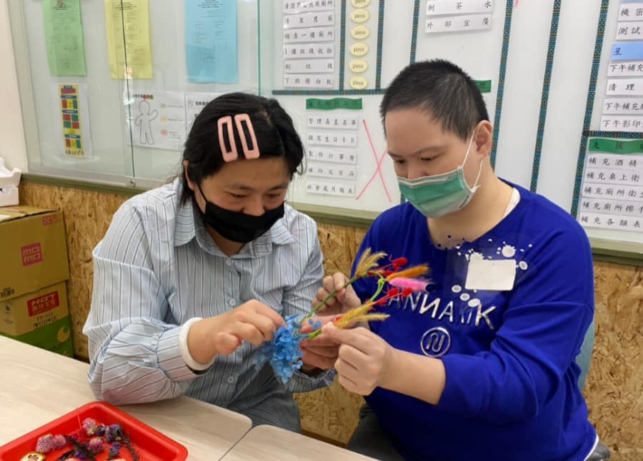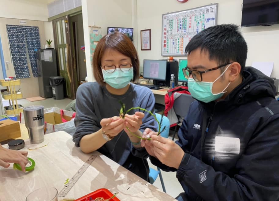 講師運用園藝活動與人體構造圖畫的結合,幫助會員述說自己的心情,這次採用兩兩一組肩並肩的合作,會員們從中分享自己挑選的乾燥裝飾素材,大家盡情享受其中的樂趣![]()