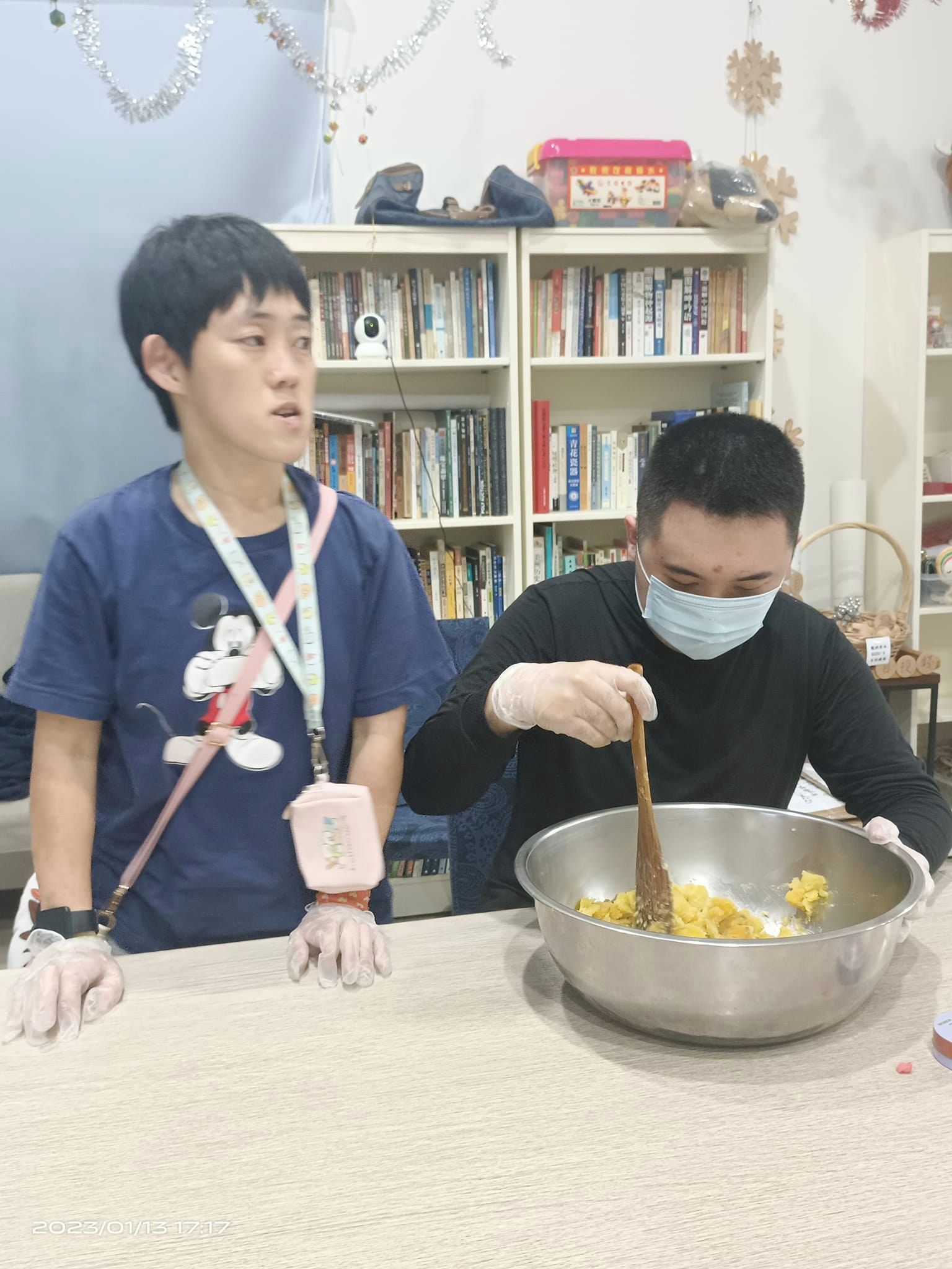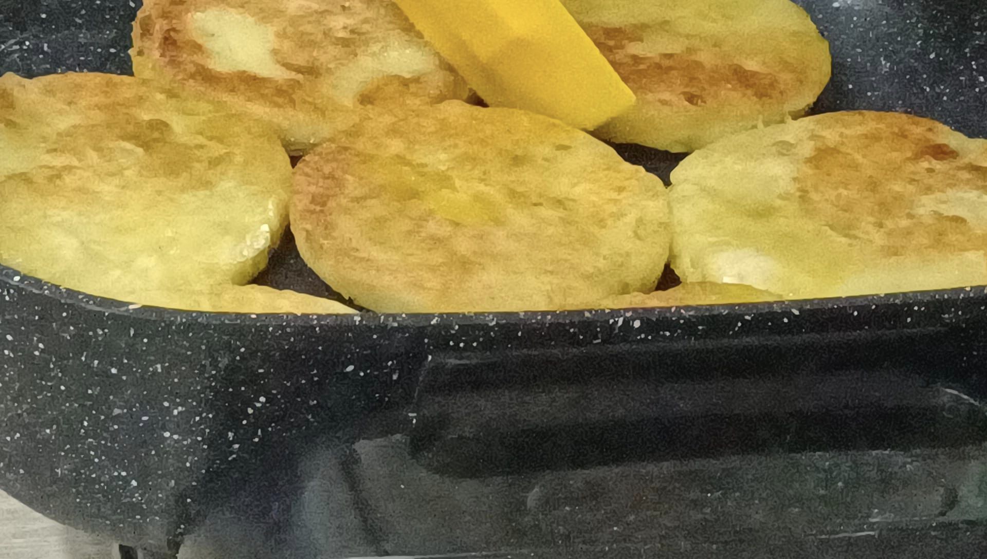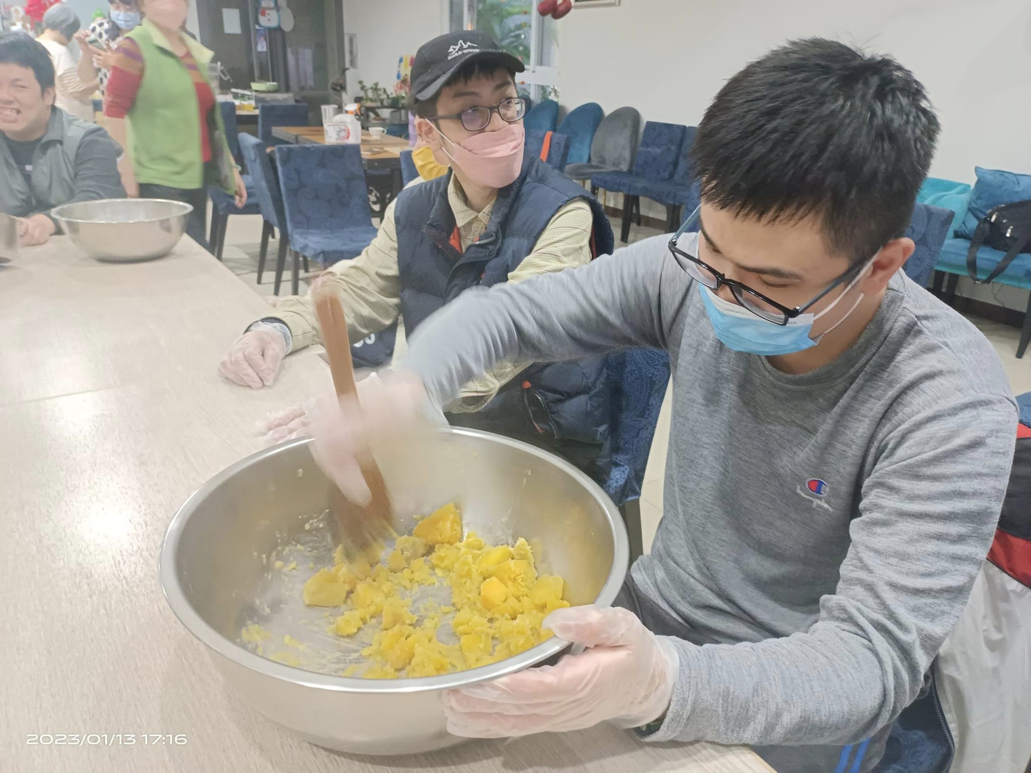 週五傍晚,龍潭肯納家園食藝課,花花老師帶著孩子們做點心:先把地瓜蒸熟,大家合力搗碎成地瓜泥,加些糯米粉,和一和丶揉一揉,慢慢就變成麵糰;拍扁後,用模型壓成一個個圓形,放到鍋子煎一煎,金黃可口的地瓜煎餅上桌了!
