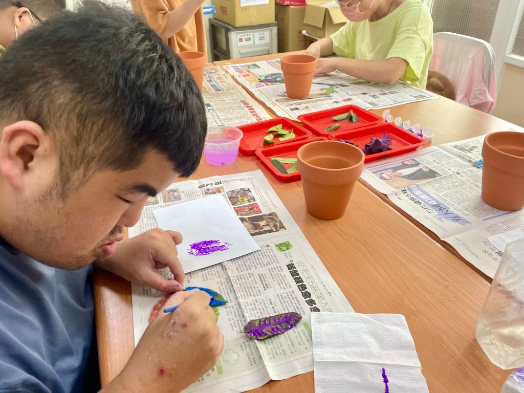 今天做 #樹葉拓印彩繪盆栽 ,邀請學員們將秋海棠放在耳朵旁,聽聽看植物在說什麼~