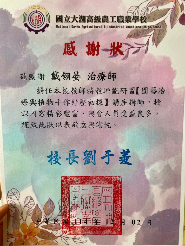 感謝大湖農工劉校長親自頒發感謝狀🥹